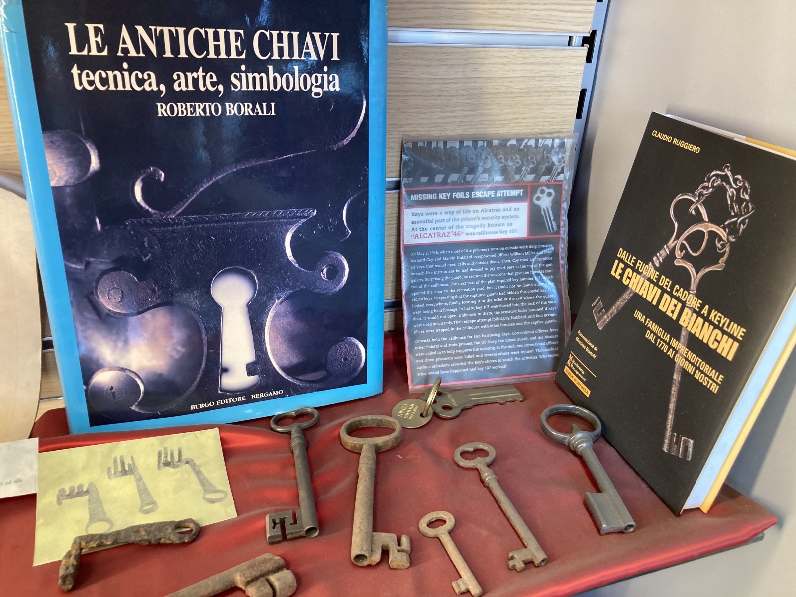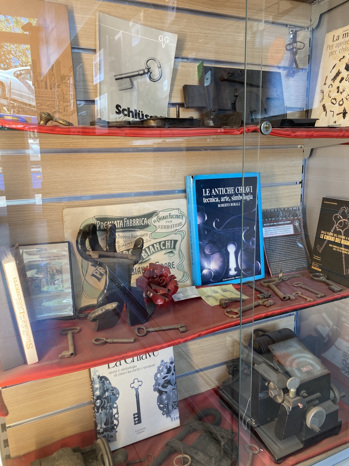 L’arte del serraturiere esiste da lungo tempo, abbiamo quindi pensato di allestire una piccola porzione del nostro negozio per esporre la nostra collezione di oggetti che testimoniano come gli strumenti del serraturiere, chiavi, serrature e lucchetti si sono evoluti nel tempo. Già a partire dall’epoca dei romani ci sono reperti che testimoniamo l’utilizzo di dispositivi meccanici con cui tramite una chiave si voleva consentire alle persone di poter chiudere in sicurezza le porte di quel periodo storico. La collezione LA CHIAVE si è poi arricchita negli anni anche con numerosi libri sul tema. Letteratura che è stata raccolta ed acquistata negli anni durante vari incontri professionali e visite ai musei più blasonati d’Europa.